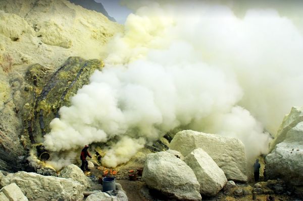 At the cracks of the outlets, the acid vapors condense in contact with the atmosphere, thus passing from the gaseous state to the liquid state before solidifying while cooling. 12 tons of sulfur appear every day at the bottom of the crater making Ijen Crater a real sulfur plant. Broken into plates or small blocks, it is transported on the backs of the miners out of the crater.