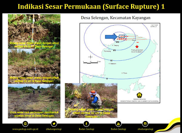 Field observations and detailed mapping show surface deformation or surface rupture and soil cracks which cause damage to roads and buildings. Surface faults were found in Sambik Bengkol Village, Gangga District; Beraringan Village, Kayangan Village, Kayangan District; and Selengan Village, Kayangan District. Surface cracks and faults found in all three areas are generally west – east.