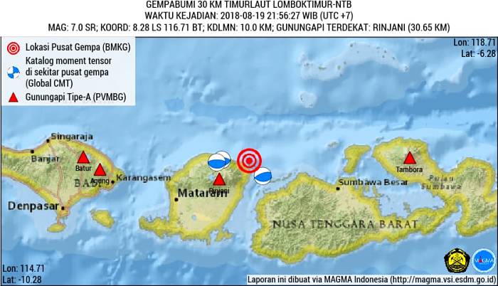 Herewith, we submit a response report on the occurrence of earthquakes in East Lombok, NTB based on information obtained from BMKG, Jakarta and analysis of the Center for Volcanology and Geological Disaster Mitigation as follows: